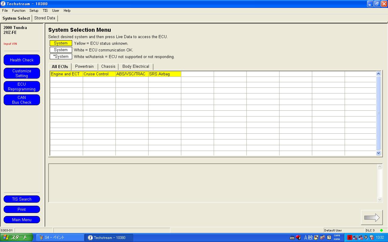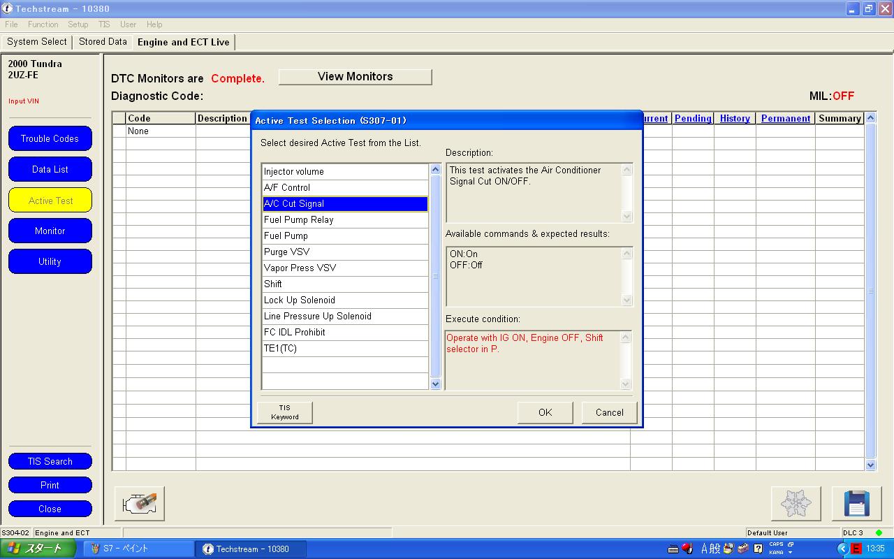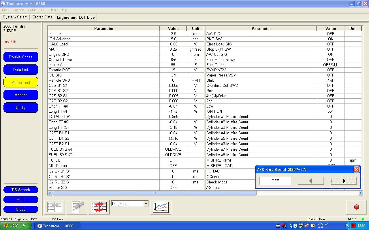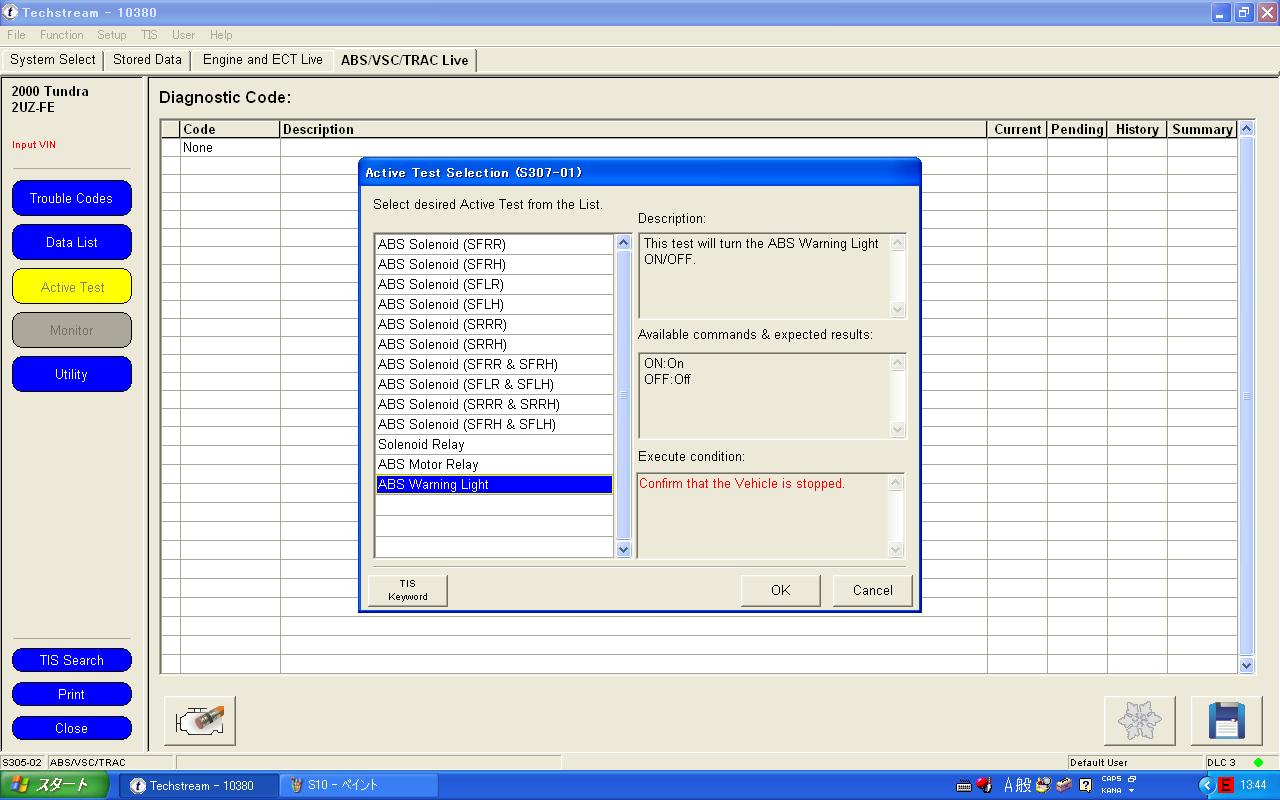ソフトを立ち上げたら、interface selectにてMongooseを選択します。あとはVehicle connectをクリックするとTechstreamがすぐに車種を判別します。 アクセスできたECUは4個。例として停車中にテストできるA/C、ABSのActive testをしてみました。